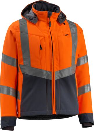 Fluorescerende softshelljakke med reflekser. Åndbar, vindtæt og vandafvisende med fleecefor. Aftagelig hætte og forlænget ryg.