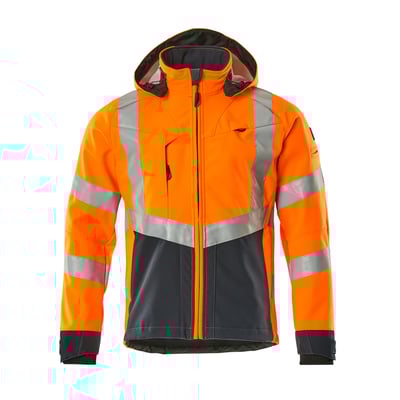 Fluorescerende softshelljakke med lodrette og skrå reflekser. Tofarvet, åndbar, vindtæt og vandafvisende med fleecefor.