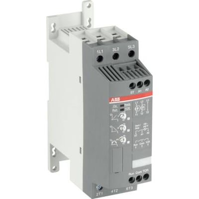 ABB softstarter PSR45-600-11 med 45A, 400V AC og 22 kW. Inkluderer by-pass kontaktor og 24VAC/DC styrespænding.