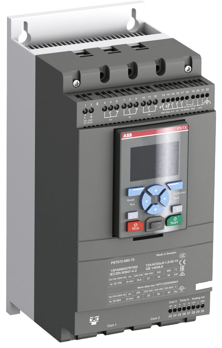 PSTX-serien repræsenterer ABB's avancerede softstartere, der tilbyder en komplet og alsidig løsning til motorstarter-applikationer med medium og store motorer. Disse softstartere er det mest komplette alternativ til enhver anden type motorstarter.