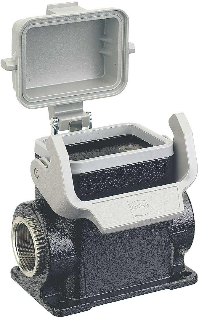 Sokkelhus Han 6 B i sort udgave fra Harting. Til krævende miljøer, 2xM20, med 1 bøjle og låg.