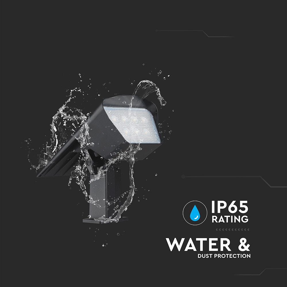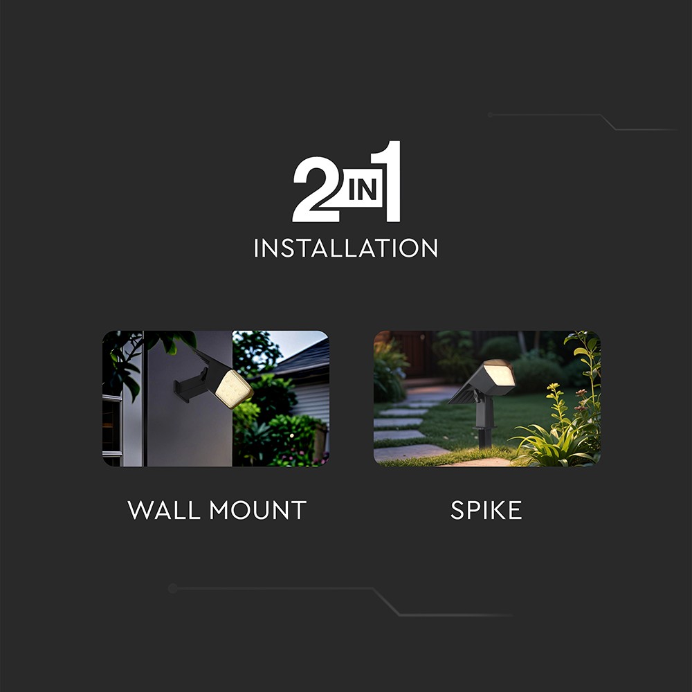 Alsidig solcellelampe i sort ABS. 2-i-1 design som spyd- eller væglampe. 100lm lysstyrke, IP65-klassificeret og 3-i-1 CCT farvetemperatur.
