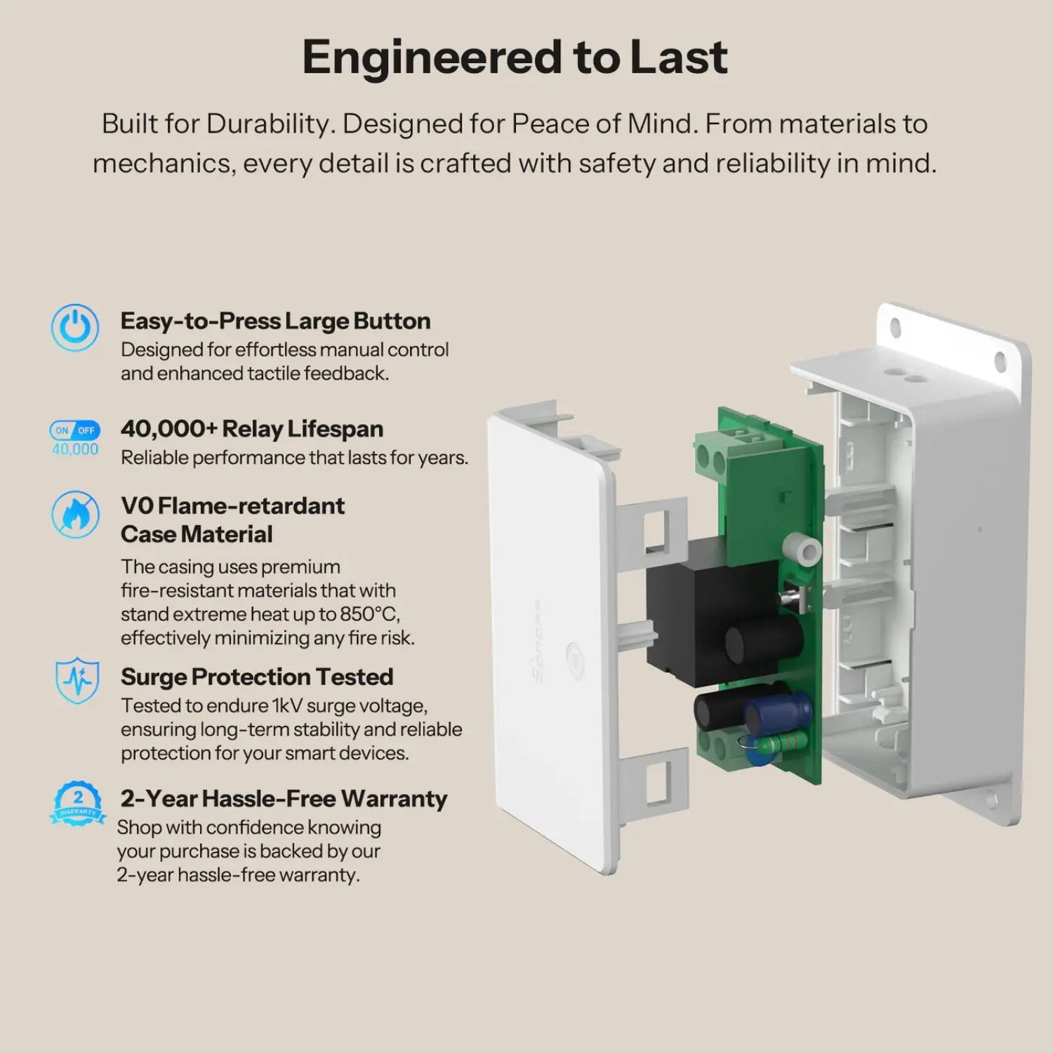 Med SONOFF Basic Gen5 får du mere end bare et almindeligt relæ. Det innovative Magic Switch Mode gør det muligt at styre enheden via appen – selv når den fysiske vægkontakt er slukket. Du kan nemt oprette automatiske scener, tidsplaner eller koble relæet sammen med stemmestyring for maksimal bekvemmelighed. Det brede trykfelt på relæet gør betjeningen enkel og præcis, så du hurtigt kan tænde eller slukke for enheder uden at skulle bruge appen. Denne løsning kombinerer funktionalitet og brugervenlighed i ét kompakt design.