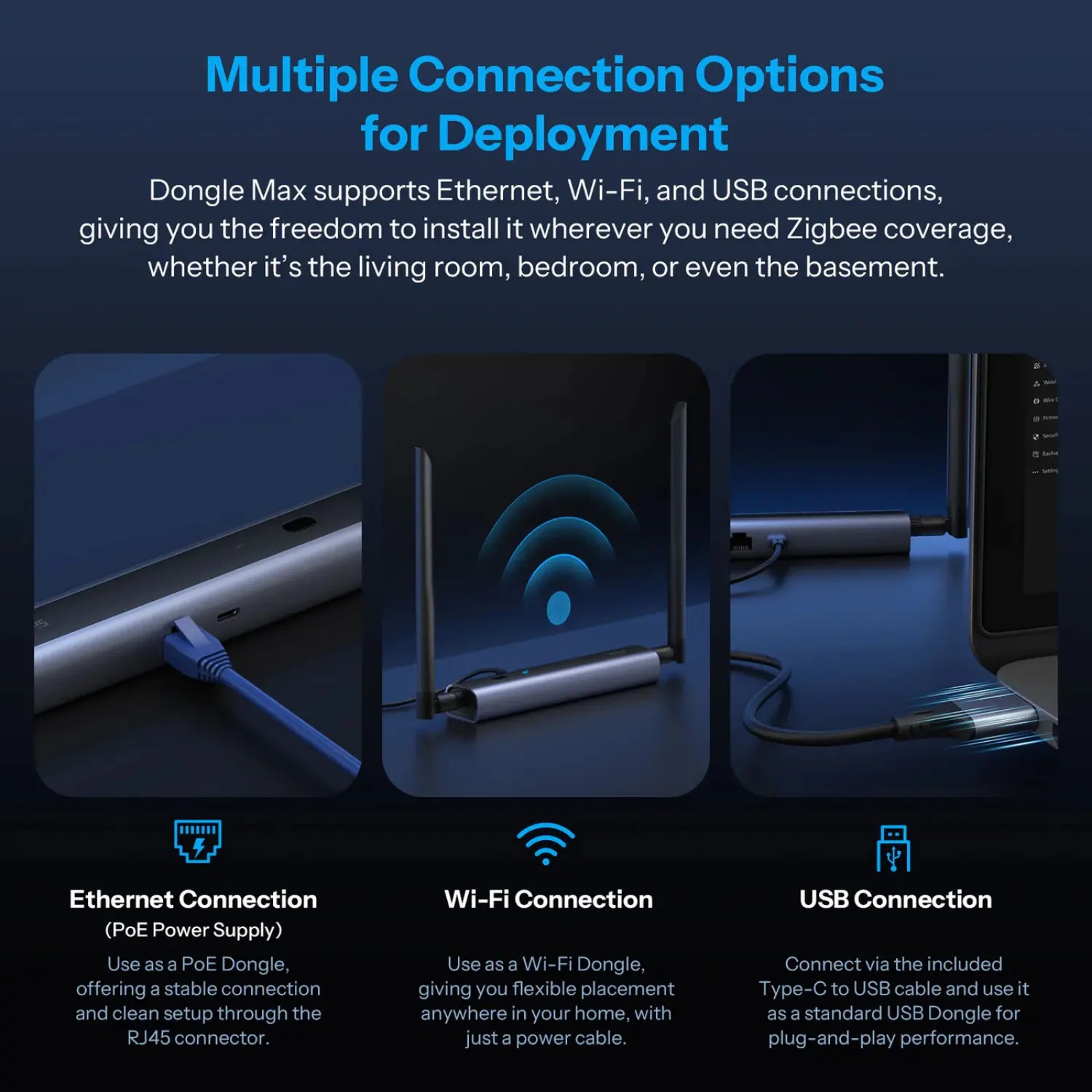 Denne Zigbee dongle er designet til maksimal fleksibilitet. Den understøtter både Ethernet, Wi-Fi og USB, hvilket gør det nemt at placere donglen, hvor det passer bedst i dit hjem. Selv hvis din router står langt væk, kan den trådløse adgang sikre en stabil forbindelse. Den er ideel til både begyndere og erfarne brugere, der ønsker en driftssikker og enkel løsning til at forbinde og administrere deres Zigbee-enheder.
