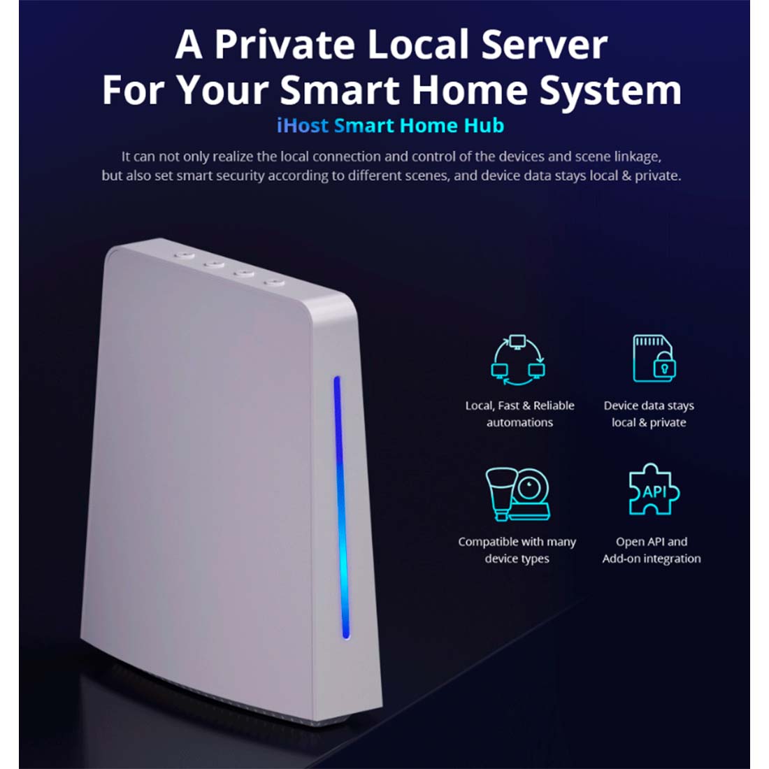 Alle data, inklusive scenelogs, driftslogs og sikkerhedslogs, gemmes i en lokal database for at beskytte dine data og sikre privatliv. iHost tilbyder ligesom Homey mange muligheder for integration med andre platforme. Med iHost kan du udnytte åben API og Docker containerisering til at installere eller udvikle flere add-ons efter dine behov, hvilket giver mulighed for en personlig tilpasning af dit smart home.