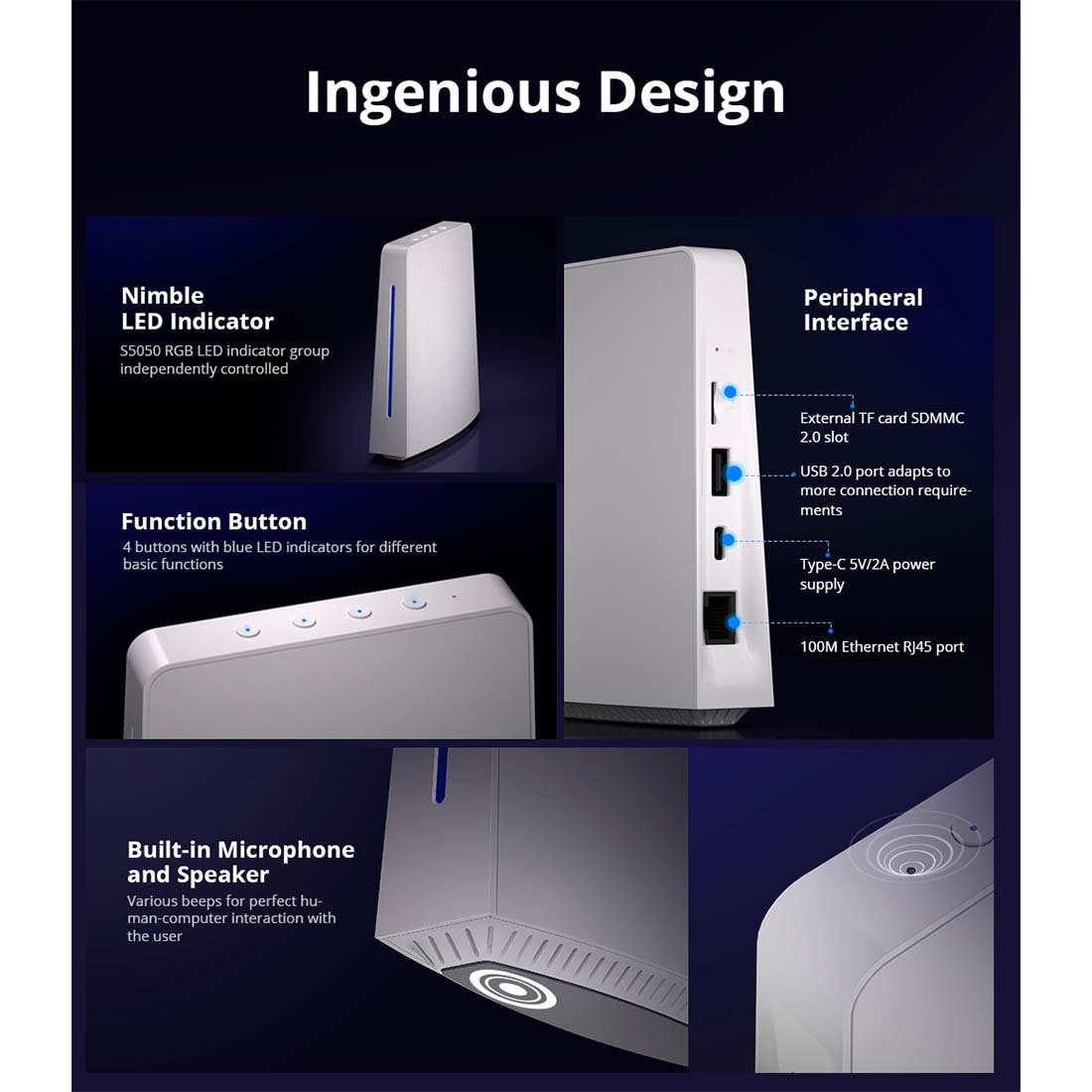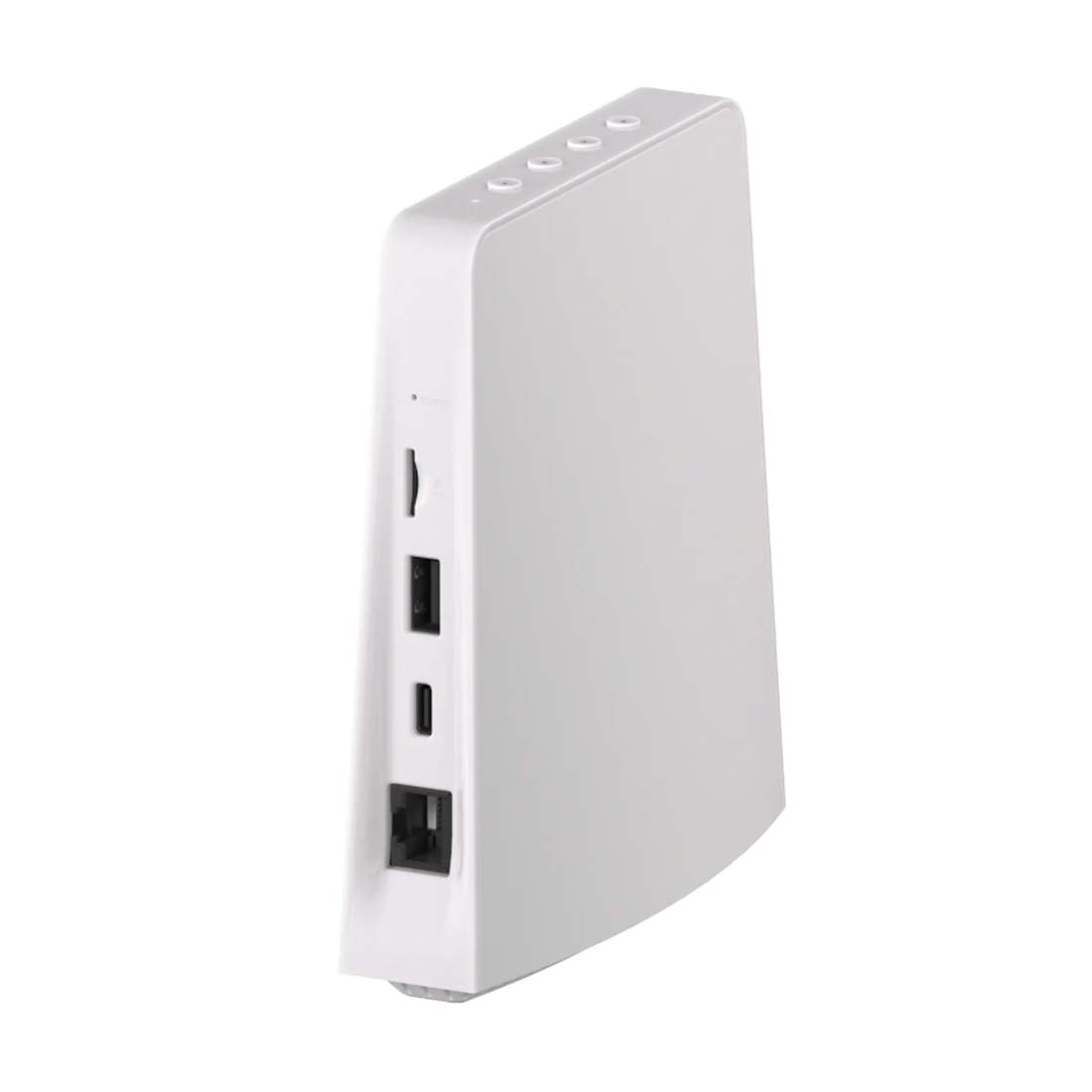 - SD-kort slot, USB-port, USB Type-C strømindgang, Ethernet-indgangsport og højttaler på bagsiden/bunden