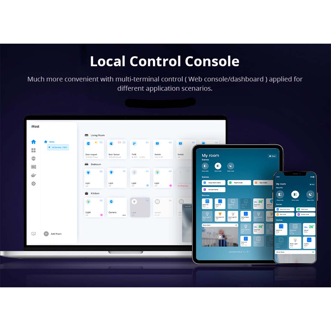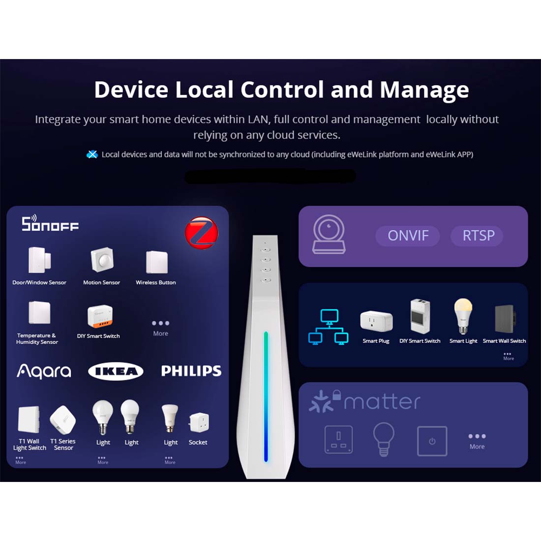 iHost understøtter tilslutning og styring af LAN-enheder. Disse enheder fortsætter med at fungere, selv når internettet er nede, og du kan administrere op til 128 underenheder. iHost fungerer også med Zigbee-routerenheder, som kan udvide Zigbee-netværksområdet og muliggøre fuld husstyring. Som en Zigbee hub kan iHost oprette dit eget Zigbee-netværk og fungere som et alarmsystem.