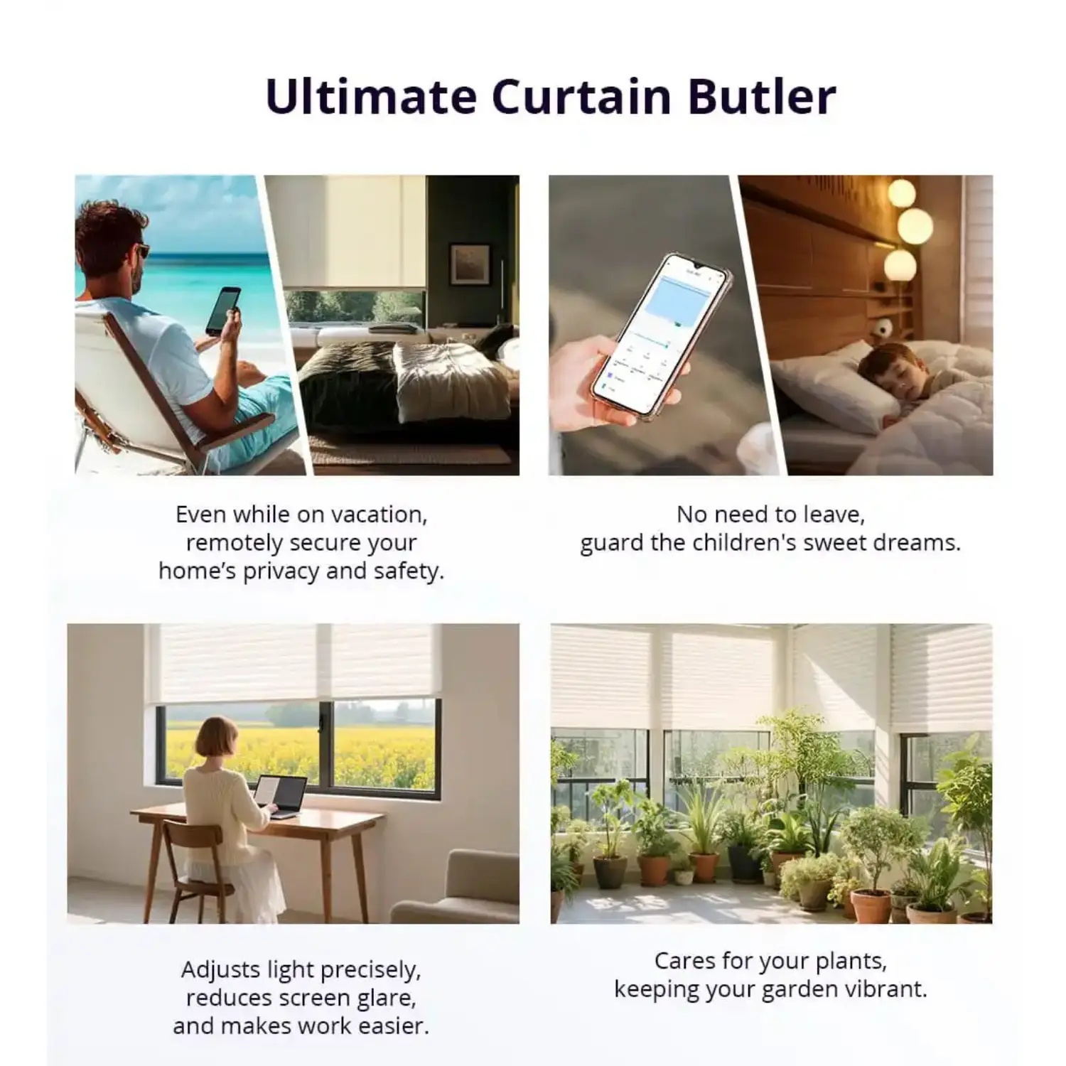 Smarts gardiner giver dig fleksibilitet og kontrol, uanset hvor du befinder dig. Med SONOFF’s intuitive app kan du planlægge åbne- og lukketider eller forbinde systemet til stemmestyring. Det betyder, at du kan sige farvel til manuelle betjeninger og i stedet bruge din stemme eller telefon til at justere lysindfaldet. Et smart rullegardin kan nemt justeres efter tidspunkt på dagen, hvilket bidrager til et behageligt indeklima og reduceret energiforbrug.
