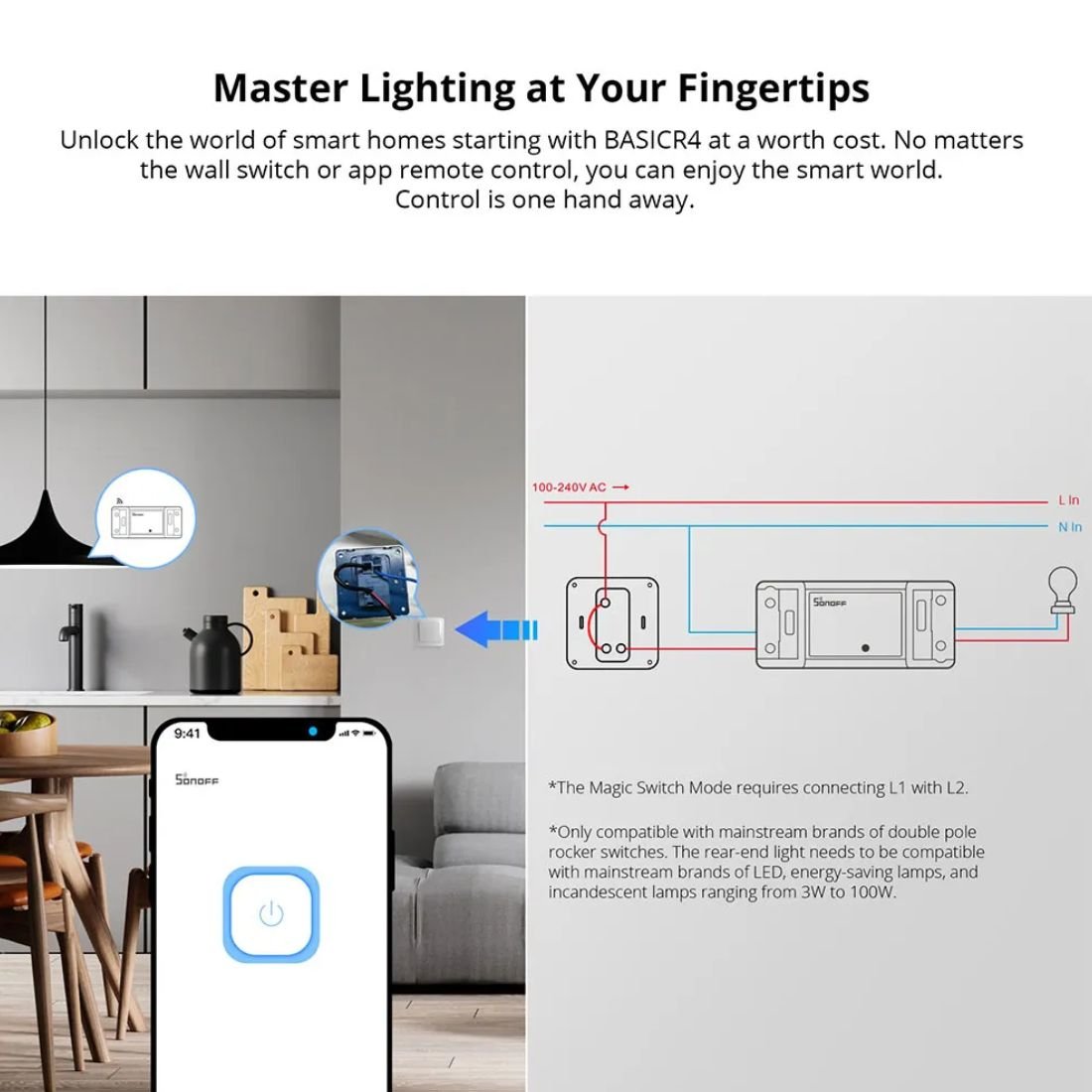 Med Sonoff switch kan du nyde friheden til at styre dit hjem uanset din placering. Denne switch er nem at integrere med dit hjemmenetværk, hvilket giver dig øjeblikkelig adgang til alle dine tilsluttede enheder via appen eWeLink. Styring af dine enheder er intuitivt og fleksibelt, med mulighed for at sætte tidsplaner, timer og oprette smarte scener, som automatisk justerer dine enheder baseret på dine daglige rutiner. BASICR4 smart switch er ikke kun praktisk, men også en tidsbesparer, der giver dig mere tid til det, der virkelig tæller.