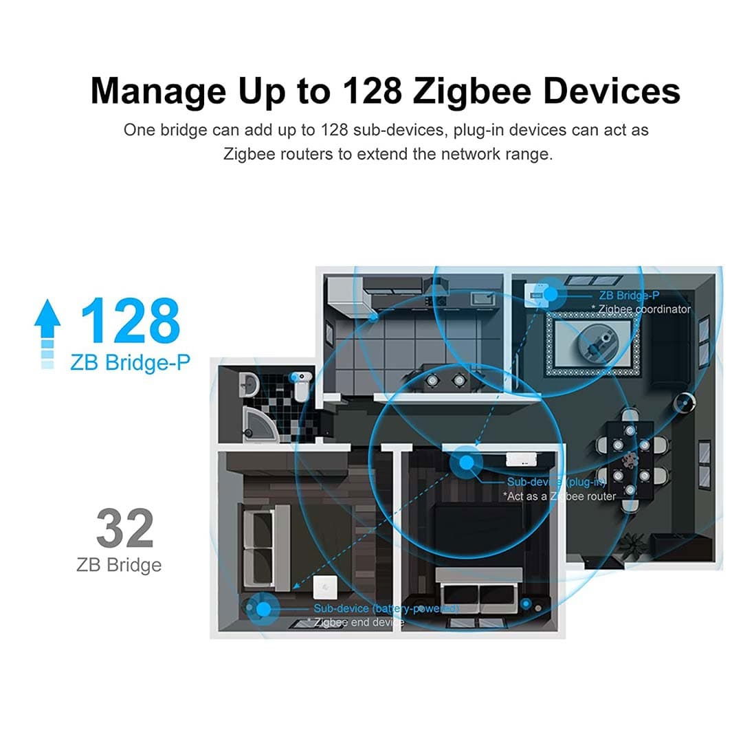 Med sin lille og kompakte størrelse kan ZBbridge styre op til 128 enheder på én bridge. Dette inkluderer ZigBee-baserede afbrydere, DIY switches, sikkerhedssensorer og meget mere.