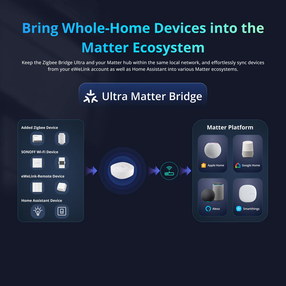 SONOFF Zigbee Bridge Ultra er designet til at forbinde enheder fra både Zigbee- og Matter-økosystemet, hvilket giver dig fuld kontrol og fleksibilitet i dit smarthome. Ved at placere Zigbee Bridge Ultra og din Matter-hub på samme netværk, kan Zigbee-underenheder integreres problemfrit. Denne integration er begrænset til SONOFF- og eWeLink Zigbee-enheder for at sikre stabil og effektiv drift.