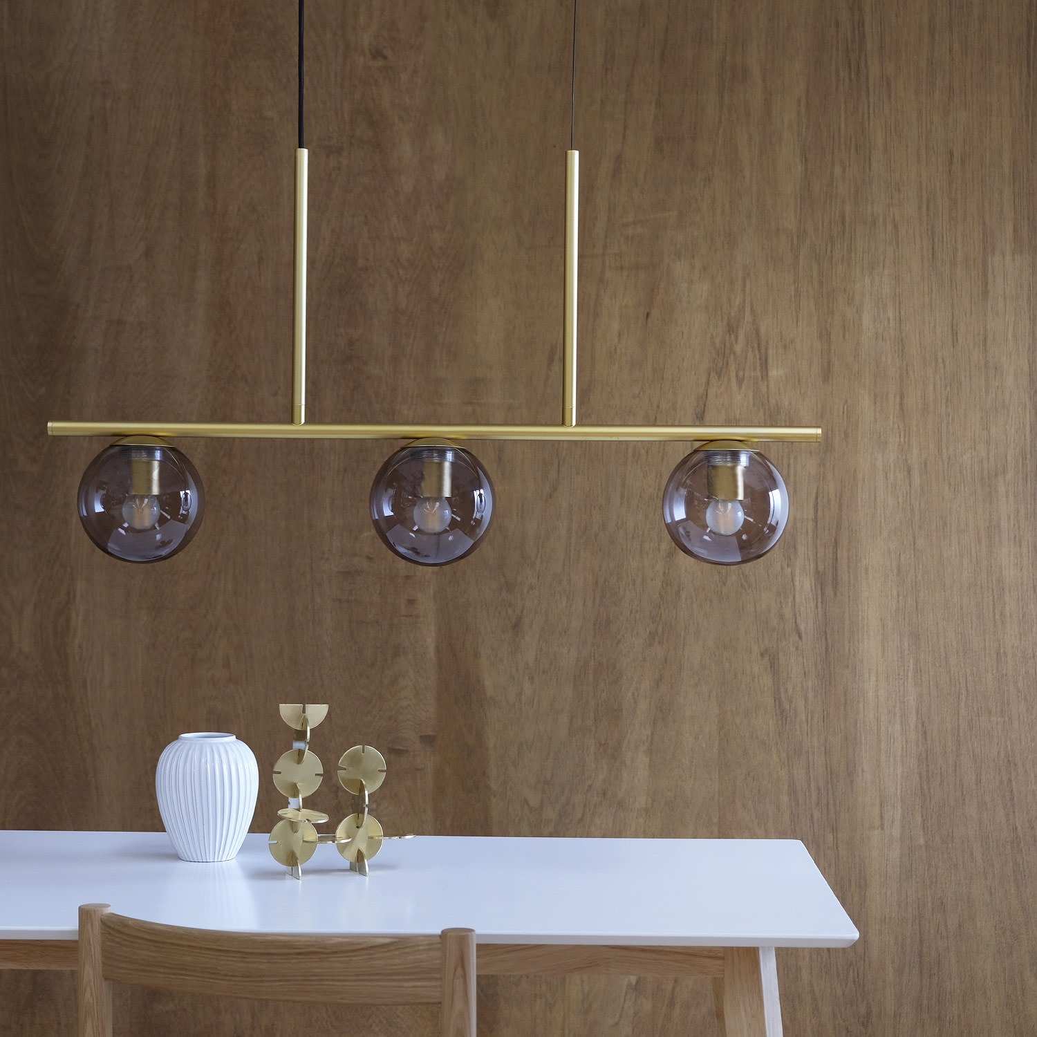 Denne elegante Sophia langbordspendel kombinerer et klassisk design med moderne detaljer. Pendlen er udført i messing med tre røgede glas skærme, der giver et blødt og behageligt lys. Perfekt til spisebordet eller over køkkenøen.