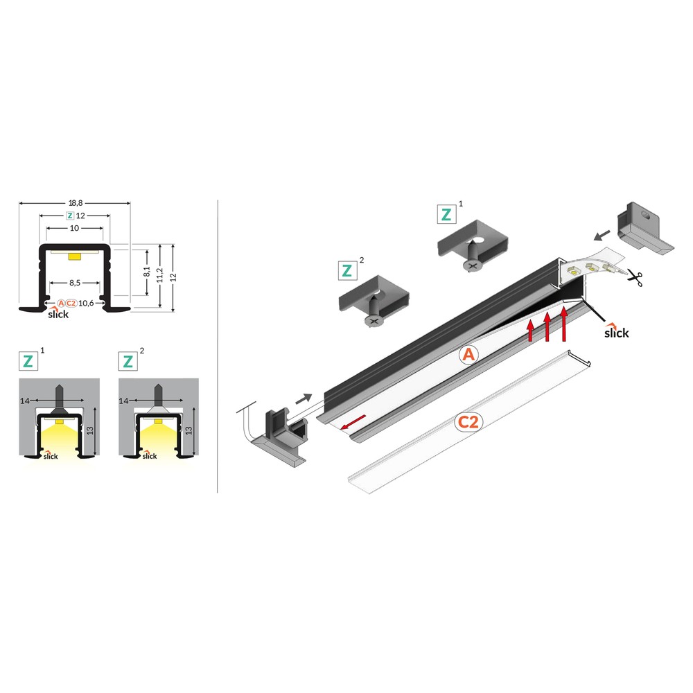 Sort anodiseret aluprofil SMART-IN10 AC2/Z med indbygget LED skinne. Denne profil er ideel til dig, der ønsker en elegant og funktionel løsning til LED-belysning.