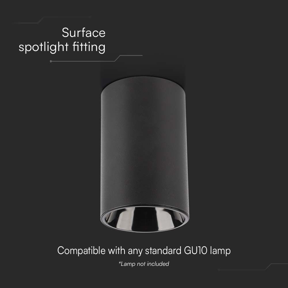 Den sorte runde overflade spotlampe fra V-Tac Pro serien er designet til at tilføre et stilrent og moderne udtryk til dit hjem eller kontor. Med en fatning til GU10 pærer giver denne lampe mulighed for at vælge den belysning, der passer bedst til dine behov.