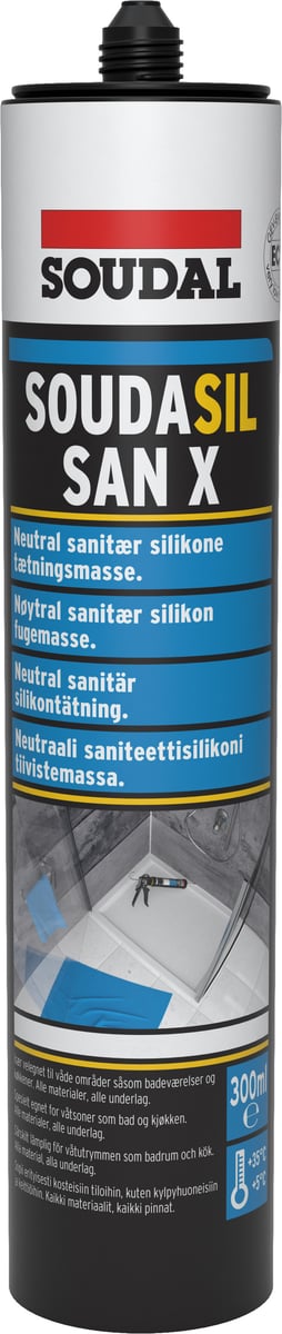 SAN X er en neutral sanitets silikone, der er velegnet til fuger i sanitære omgivelser. Den har en særdeles god vedhæftning til mange materialer og god modstandsdygtighed over for ældning, og den forbliver permanent elastisk efter afhærdning.
