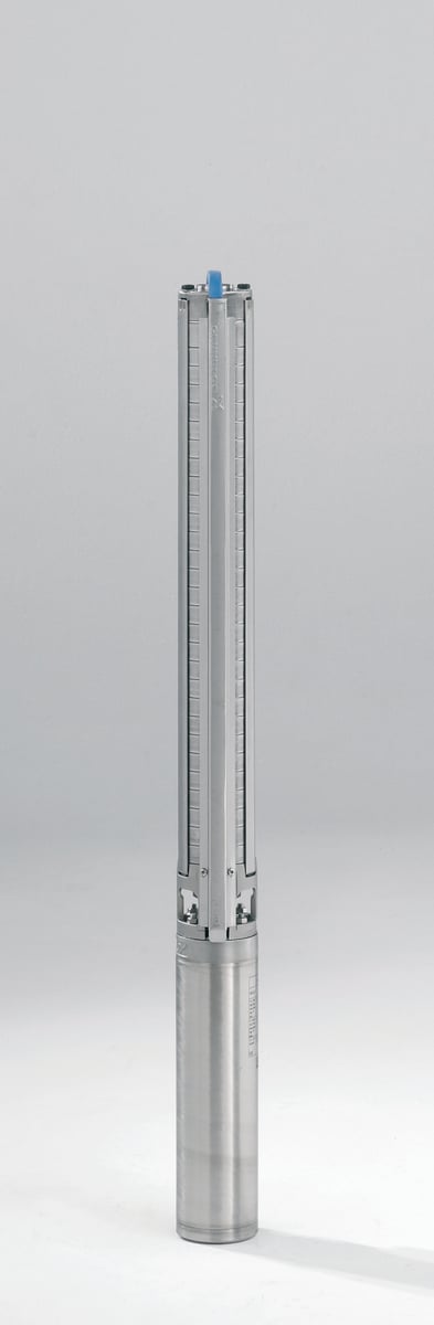 SP 5A-4NE flertrins-dykpumpe til råvandsforsyning, grundvandssænkning og trykforøgning. Pumpen er egnet til applikationer, der indebærer pumpning af aggressive væsker. Alle primære pumpedele er lavet af rustfrit stål DIN W.-Nr. 1.4401 og egnet til horisontal såvel som vertikal installation.