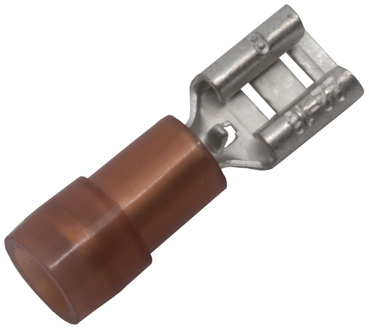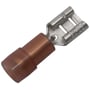 Isoleret spademuffe A1505FLS5 fra Elpress. Til 0,5-1,5mm² Cu-leder og spadestik 4,8x0,5. Fremstillet i messing med rød polycarbonat isolering.