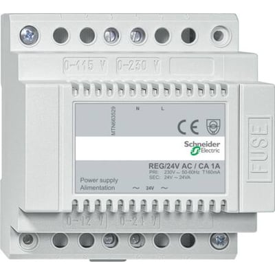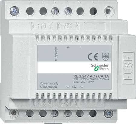 Spændingsforsyning til DIN-skinne, der leverer 24 V AC med en maksimal strømstyrke på 1A. Ideel til forsyning af apparater med ekstra lav sikkerhedsspænding.