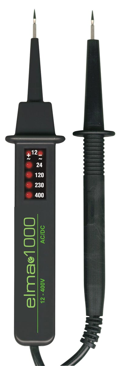 Elma 1000A er en handy sikkerhedsspændingstester med smart design og tydelig lysdiodeindikering. Automatisk polaritetsindikering.