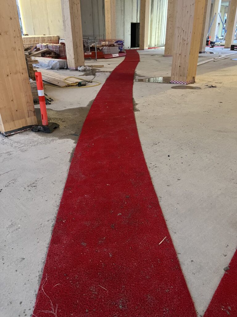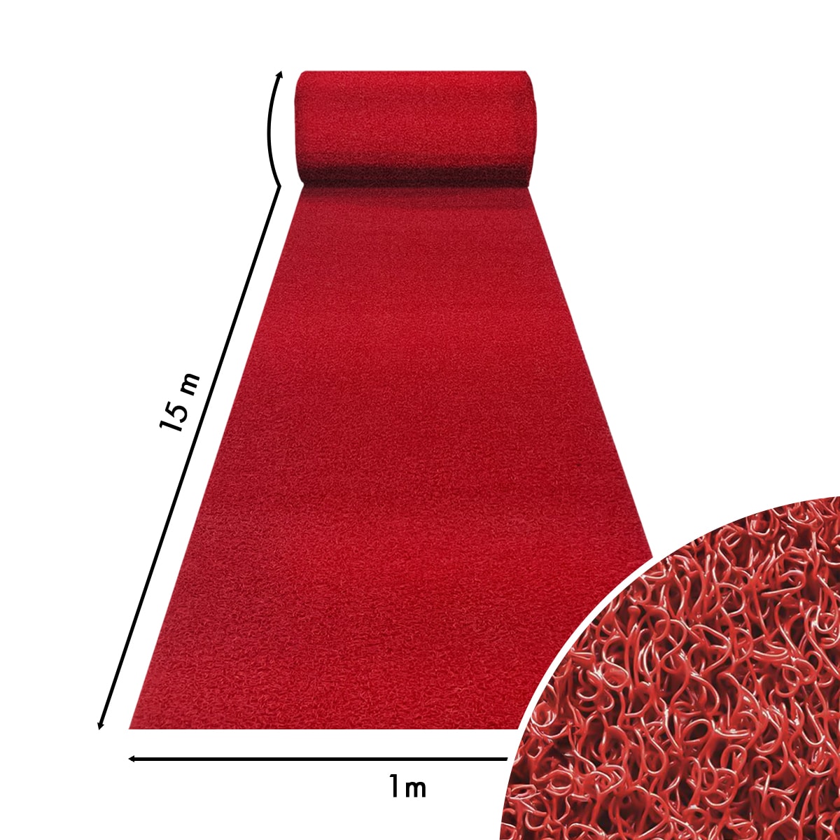 Praktisk spaghettimåtte i rød, der måler 1 x 15 meter med en tykkelse på 14 mm. Ideel til at holde gulvet rent.