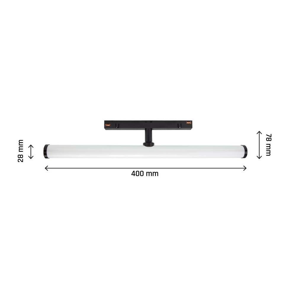 Med dimensionerne 400 x 75 x Ø28 mm passer armaturet diskret ind i de fleste rum. Produktet er IP20-klassificeret og egner sig derfor udelukkende til indendørs brug. Den integrerede lyskilde gør installation og vedligeholdelse enkel.