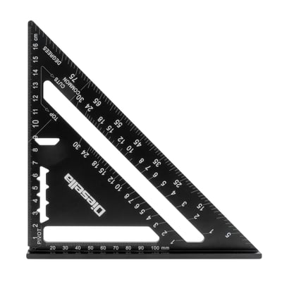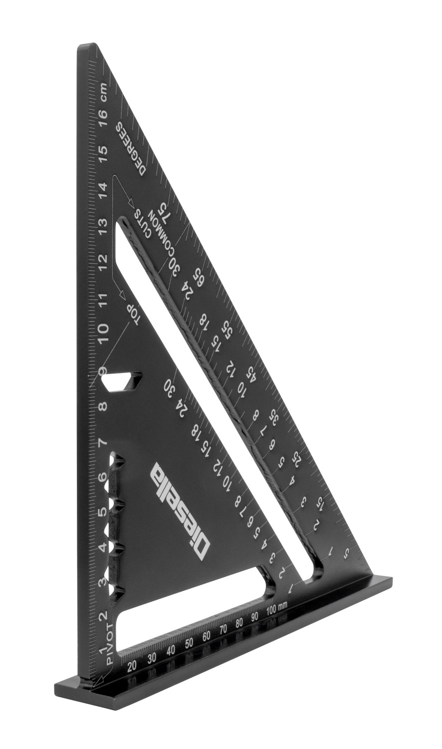 Diesella speedvinkel til præcise vinkelmålinger. Størrelse: 185 x 185 mm. Ideel til hurtige og nøjagtige opmålinger i aluminium med sort-oxideret finish.