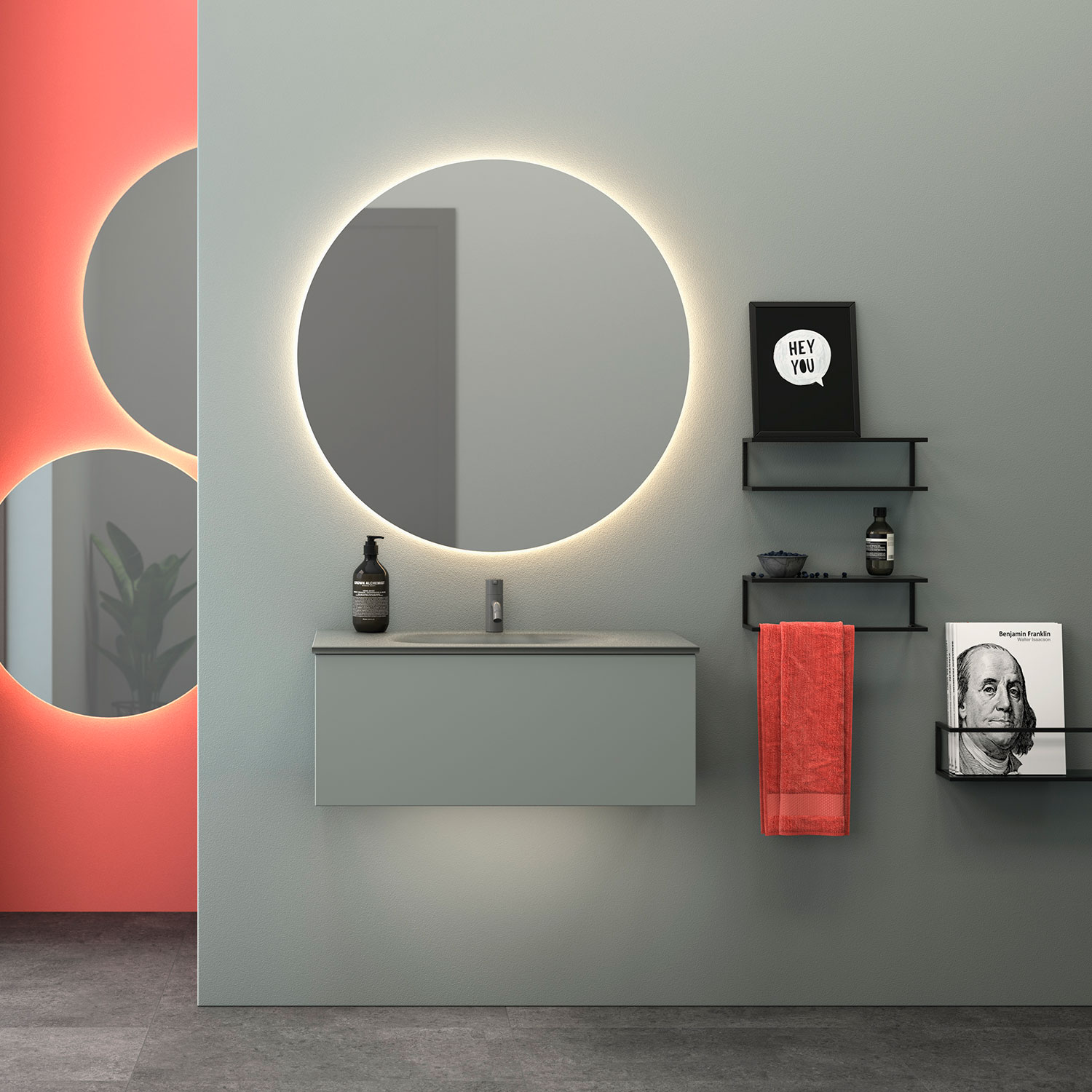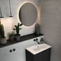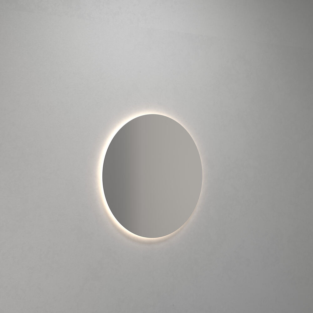 Rundt spejl med integreret backlight og en diameter på 75 cm. IP44-klassificeret, 3150K lysfarve og 2112 lm lysstyrke.