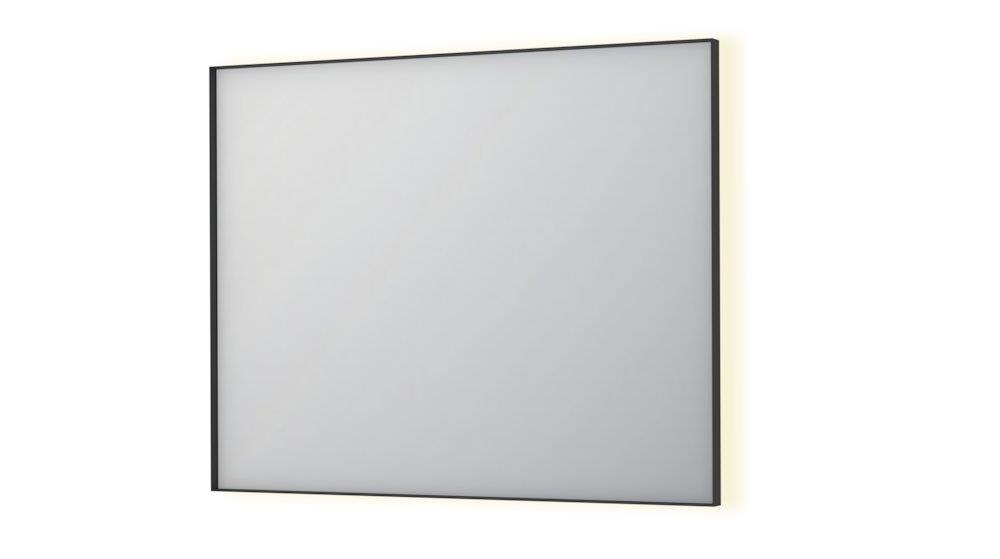 Sanibell INK SP32 rektangulært spejl på 100x80 cm med matsort aluramme, dæmpbar LED-belysning, farveskift (3000-6000K), spejlvarme og sensorkontakt. Kan monteres lodret og vandret.