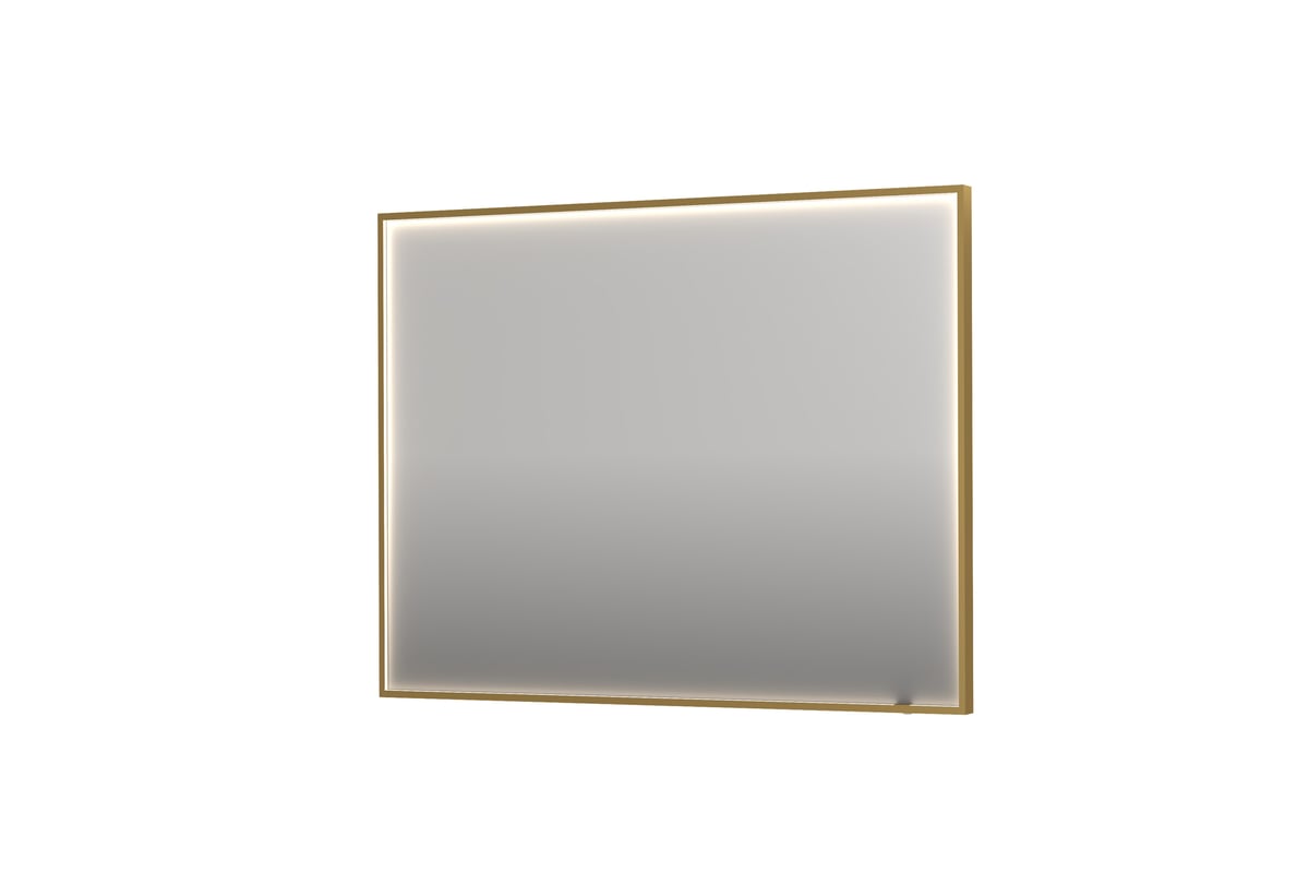 Sanibell INK SP19 rektangulært spejl, 120 x 80 cm, med børstet mat guld aluramme, dæmpbar LED-belysning, farveskift (3000-6000K), spejlvarme, sensorkontakt og memory funktion.