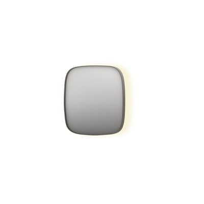 Sanibell INK SP30 superellipse spejl, 40x40 cm, på børstet rustfri stål aluramme. Dette spejl kombinerer funktionalitet med moderne teknologi, hvilket gør det til en ideel tilføjelse til ethvert badeværelse.