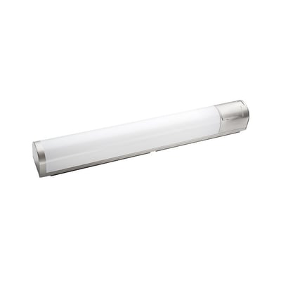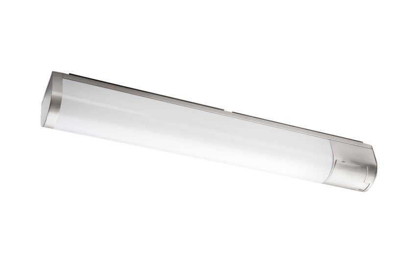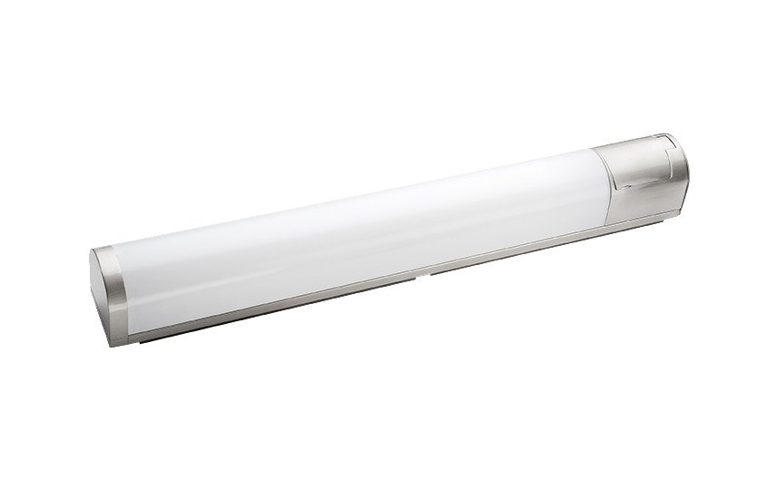 Badeværelsesarmatur til montering over spejl i børstet stål. Fremstillet i aluminium med akrylskærm. Dæmpbar med fasedæmp.