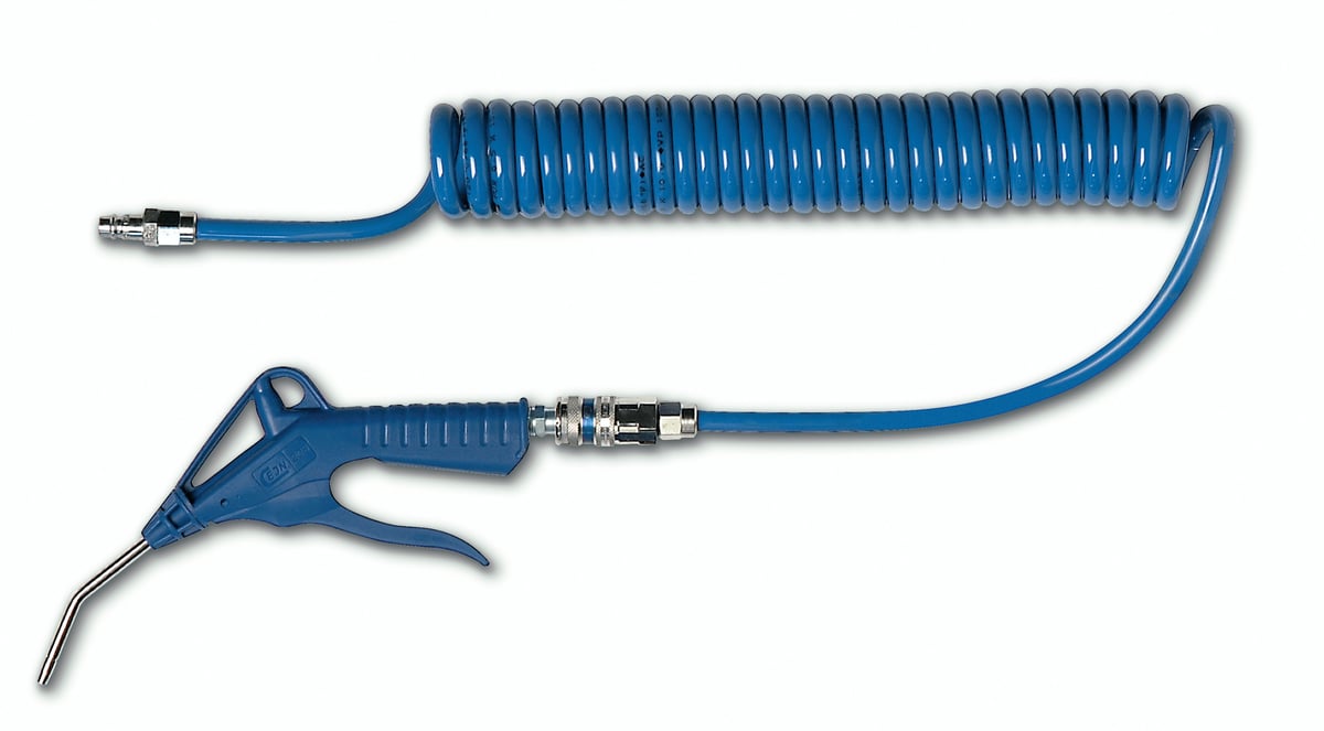 Komplet spiralslangesæt med blæsepistol, klar til brug med trykluft. Fremstillet i holdbart PUR-materiale for nem håndtering.