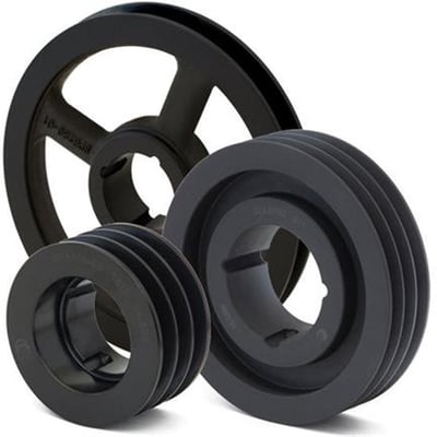 Tre forskellige kileremskiver i sort og grå støbejern, alle 2-sporede og klare til taperlock montering.