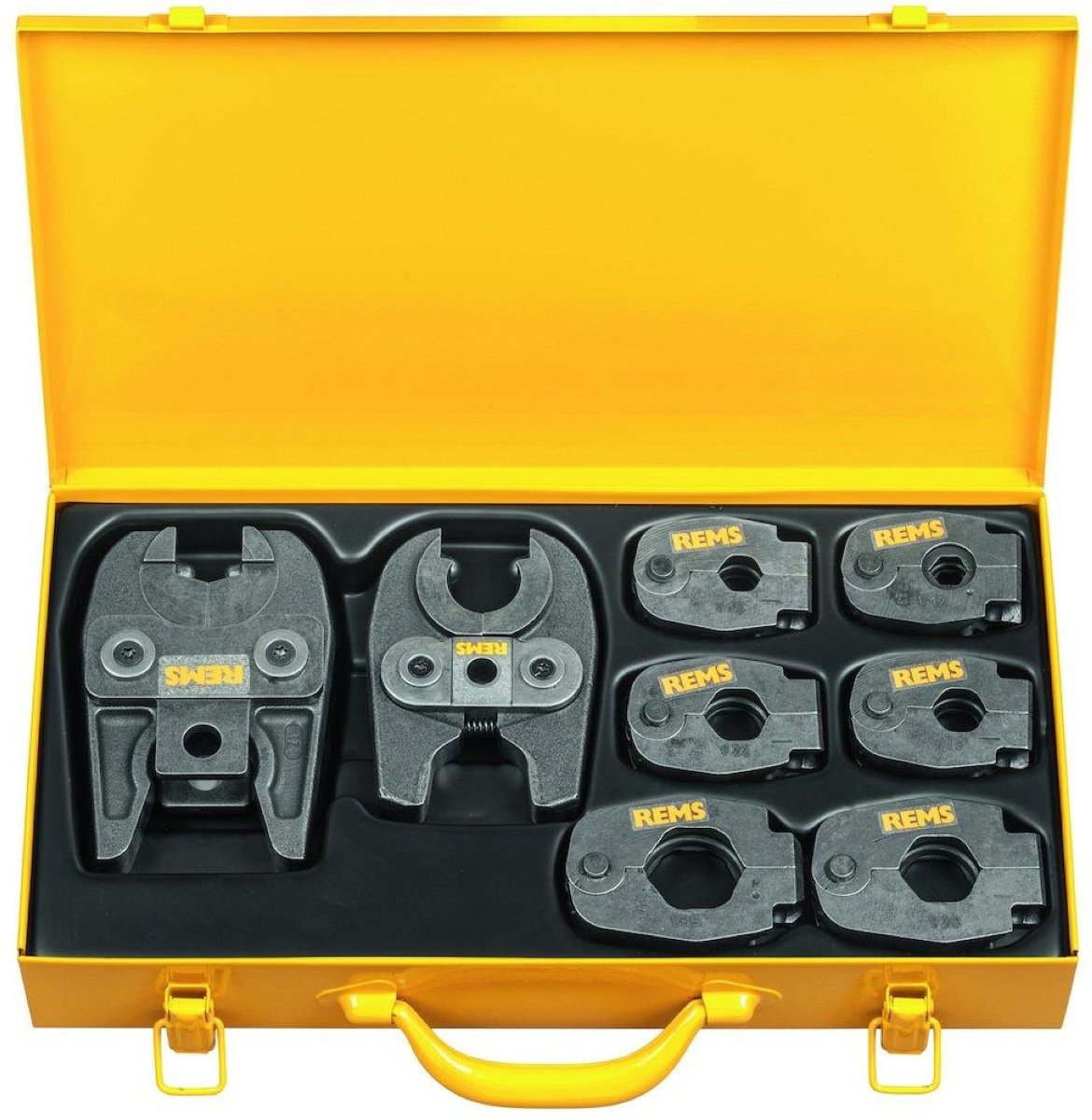 Stålkasse med indlæg til mellemtang Mini Z8 og mellemtang Z8 samt 6 stk. REMS pressringe S (Pr-2B), eller til mellemtang Mini Z1 og mellemtang Z samt 6 stk. REMS pressringe 45 gr.