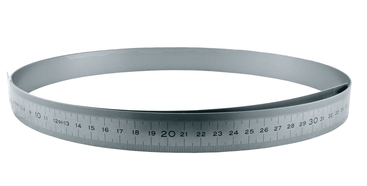 Fleksibel stållineal i rustfrit stål med venstre-mod-højre graduering. Mål: 1500x30x1,0 mm.