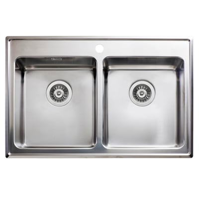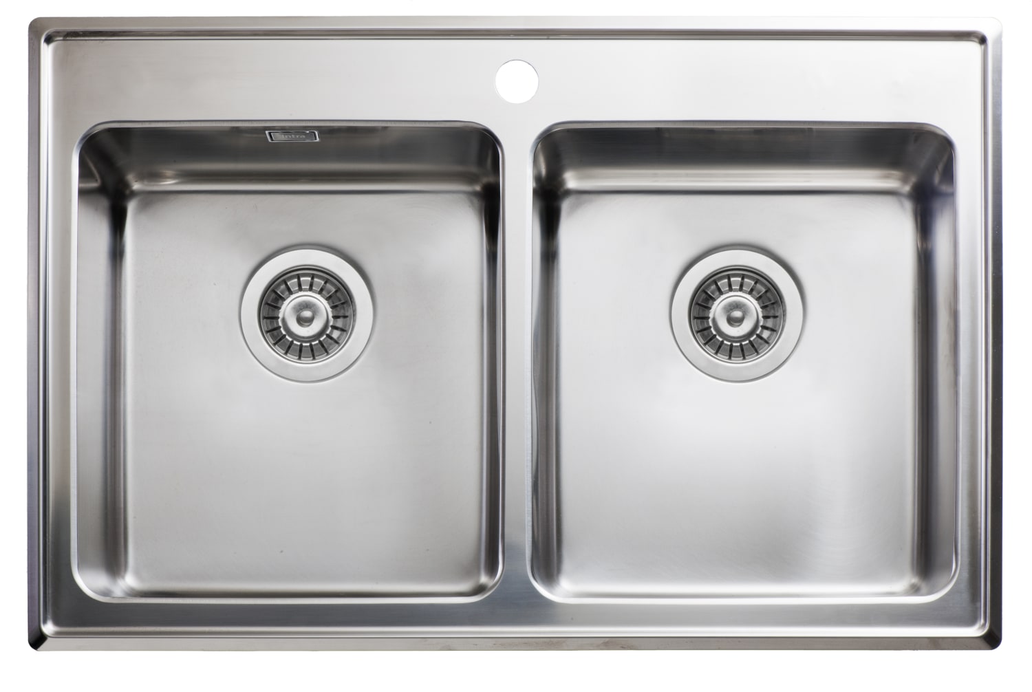 Omnia 78DF dobbeltvask med manuel strainer, vandlås, Intra-kant, nedfældning samt under- og planlimning. Fremstillet i rustfrit stål.
