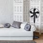 Ventilatoren har en stabil rundfod på 410 mm, der giver god balance og forhindrer, at den vælter. Betjeningen er enkel med 4 knapper, der giver dig mulighed for at vælge mellem forskellige hastighedsindstillinger, så du kan tilpasse luftstrømmen præcist til dine behov.