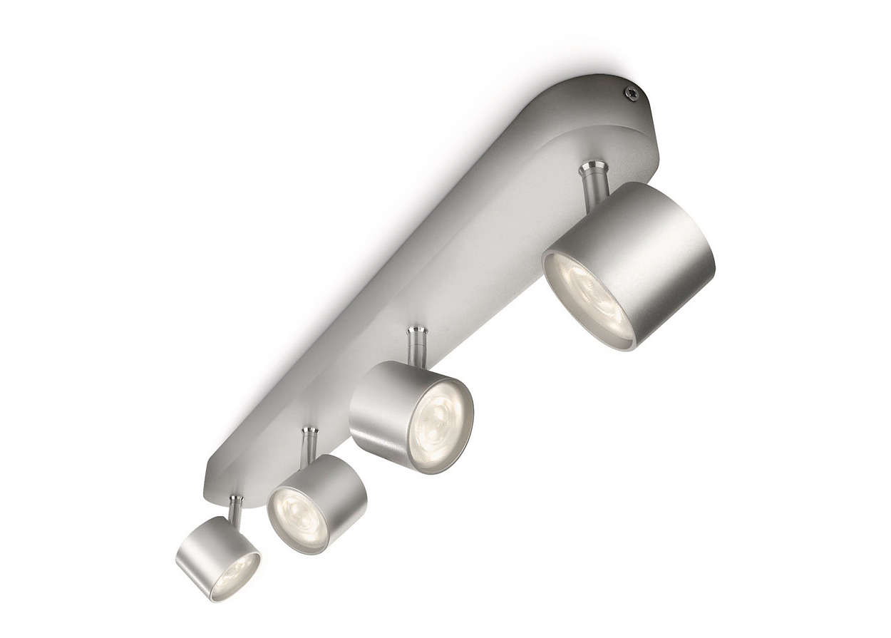 Philips Star Bar/Tube spotlampe med 4 lyskilder á 4,5W i aluminium. Dæmpbar og med varmt hvidt lys (2700K).