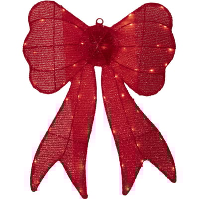 Dekorativ rød sløjfe med 60 indbyggede LED lys. Bruger 3 x AA batterier (medfølger ikke) og har en 6/18 timers timerfunktion. Til vægmontering.