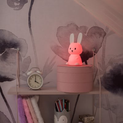 Denne charmerende kanin LED børnelampe fra Star Trading er ideel til børneværelset. Den er fremstillet i plast, kan skifte farve og er nem at betjene med en afbryder på lampebasen.