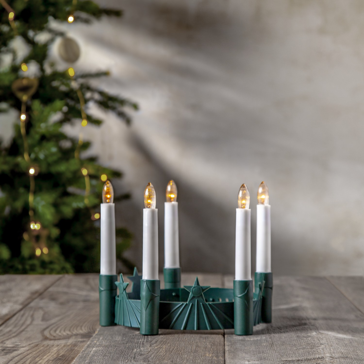 Gør klar til Lucia med denne grønne luciakrone fra Star Trading, udstyret med 5 varmt hvide LED lys og batteridrift for nem indendørs brug.