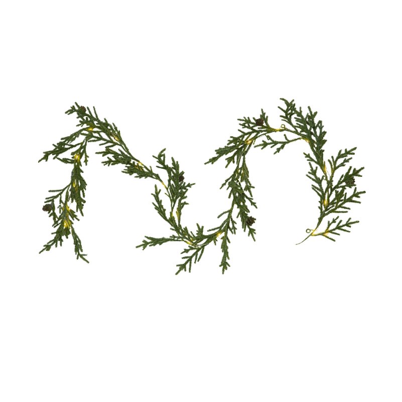 Guirlanden er fremstillet af holdbart plast i en flot grøn farve, der efterligner ægte gran. Med sine 20 indbyggede, ikke-udskiftelige LED-lys og en klar ledning, skaber den et varmt og indbydende lys.