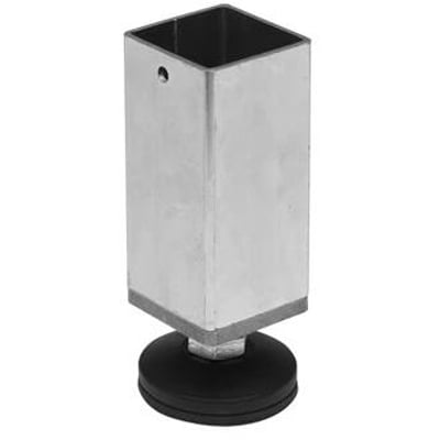 Justerbar stativfod i varmgalvaniseret stål, designet til stativrør på 40 x 40 mm, hvilket sikrer en stabil og holdbar montering.