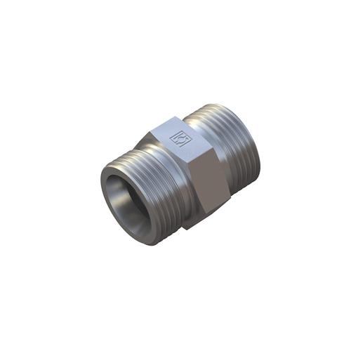 Hydraulisk samler med ens rør tilslutning i begge ender. Denne model er udført i stål med zink/nikkel overflade.