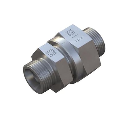 Hydraulisk retningsbestemt kontraventil til hydrauliske systemer, hvor man samtidigt bruger ventilen som rør-samler med ens dimension i begge ender. Ventilen leveres uden omløber og skæreringe.