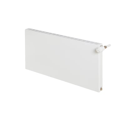 Stelrad Compact Planar type 11 radiator, hvid, 400mm høj og 3000mm lang, med synlig termostat og hvid vægmontering.Stelrad Compact Planar radiator i hvid, monteret på lys væg i et moderne interiør med stol og bord.