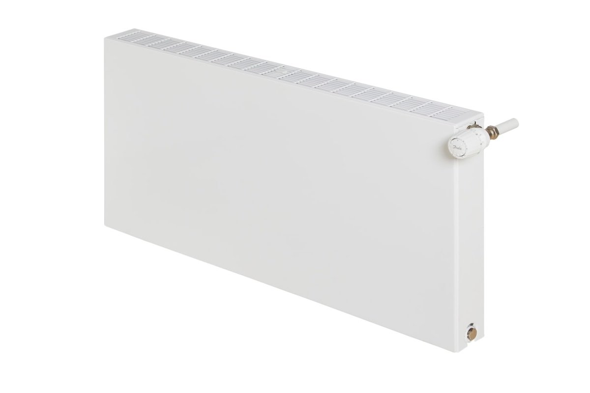 51. Stelrad Compact Planar Type 22 radiator i hvid, 600 mm høj og 900 mm lang, set fra siden med termostat monteret.Stelrad Compact Planar Type22, H600 mm x L900 mm