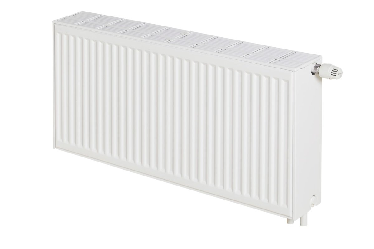 Novello er lukket med gavle og en dekorativ toprist, som passer godt til vores moderne og enkle boligstil. Novello er udstyret med en pre-installeret, justerbar ventilindsats (uden termostat), der sørger for optimal regulering samt optimal effektivitet. Den er som standard, fabriksmonteret på højre side af radiatoren. Typer 21-33 er vendbar.
