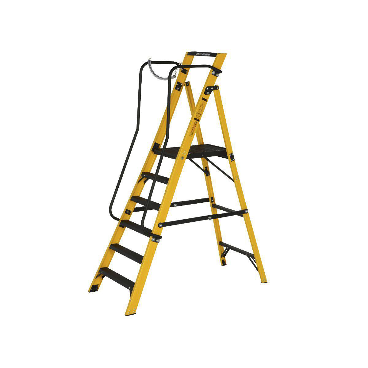 Glasfiber platformstige fra Zarges, der opfylder kravene til arbejde i højden med begge hænder fri. Konstrueret med slidstærke glasfibervanger og sikkerhedskæde for ekstra sikkerhed.