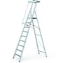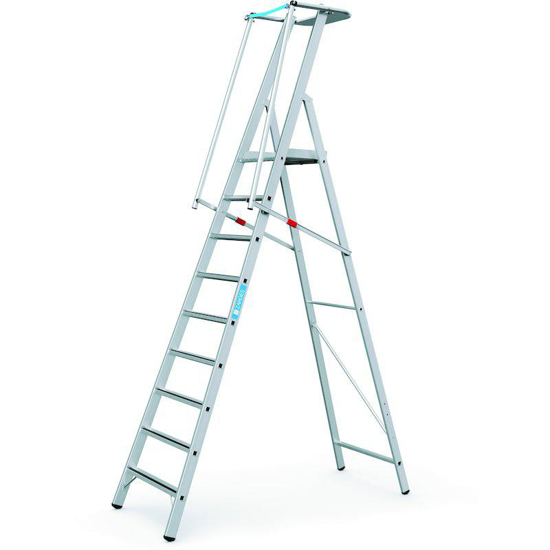 Platformstige med integreret gelænder og stor platform (400 x 400 mm). Ekstraskridsikre trin og sikkerhedsstrop. Aflægge bakke til værktøj (420 x 200 mm).
